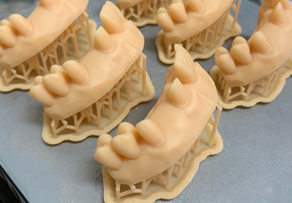 3D 列印可將口掃及桌掃 3D 圖檔列印為實體模型,用於贗復體密合度驗證、隱形矯正牙套製作、數位診斷排牙輸出等。